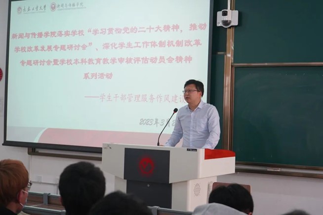 周巍老师总结了去年疫情防控的相关工作,对于学生干部的辛苦付出给予了充分肯定。他结合新学期贯彻落实学校相关会议精神和本科教学审核评估工作暨如何提升学生工作管理服务作风进行了解读和工作布置。针对学生干部日常工作、学习、生活中遇到的问题和困难,结合具体事例,从增强思想意识、把握工作重点、坚持工作原则等方面提出改进意见。他要求,学院全体学生政工干部要深入学习相关会议精神,结合自身工作抓好落实,并希望全体学生干部能够做好提升学生工作管理服务作风转变的助推器,为学校审核评估工作做出应有贡献!