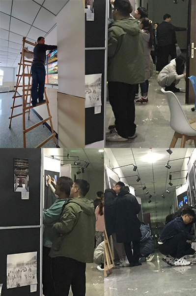 我们在现场可以看到我院教师和学生忙碌的身影。教师带领学生共同参与劳动实践,用自己勤劳的双手布置“发现工大”摄影作品展的展厅。许许多多看不着的手工细腻活和劳力活,都是教师和学生们共同完成的。