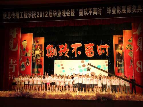这是一场没有结局的晚会,这是一场献给所有80后应届毕业生的晚会。信息传播工程学院2012届毕业晚会暨“捌玖不离时”毕业影展颁奖典礼的成功举办,突出了我院的办学特色与专业优势,彰显了我院理论加实践相结合的教学成果和高素质应用型人才的培养成果,也顺成了教育现代化和学习化社会发展的历史潮流,同时也为2012届毕业生的大学生活画上了一个圆满的句号。虽然他们即将离开学校,但他们大学生活的点点滴滴将和学校永存。我们忠诚的祝福他们前程似锦早日实现自己的理想。