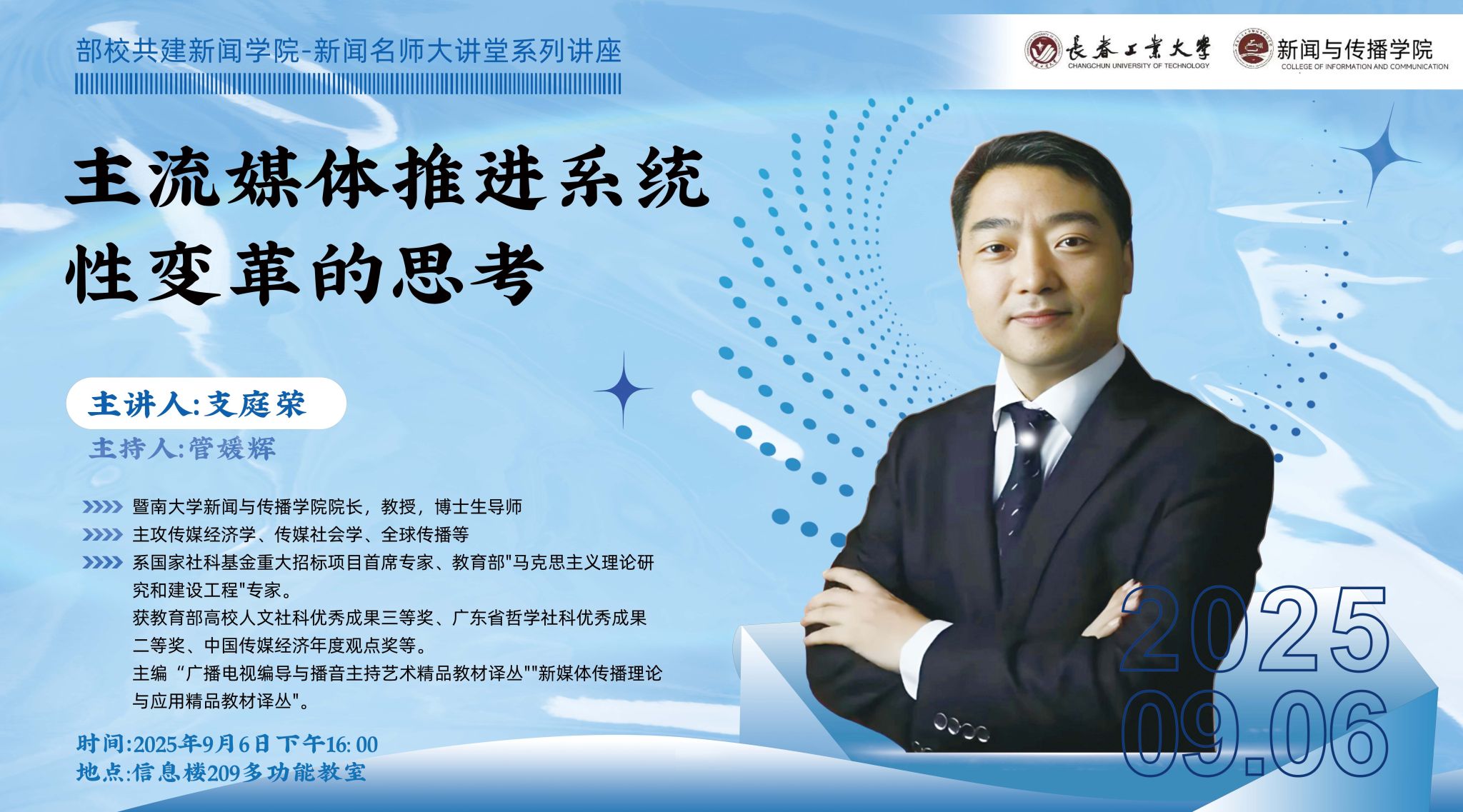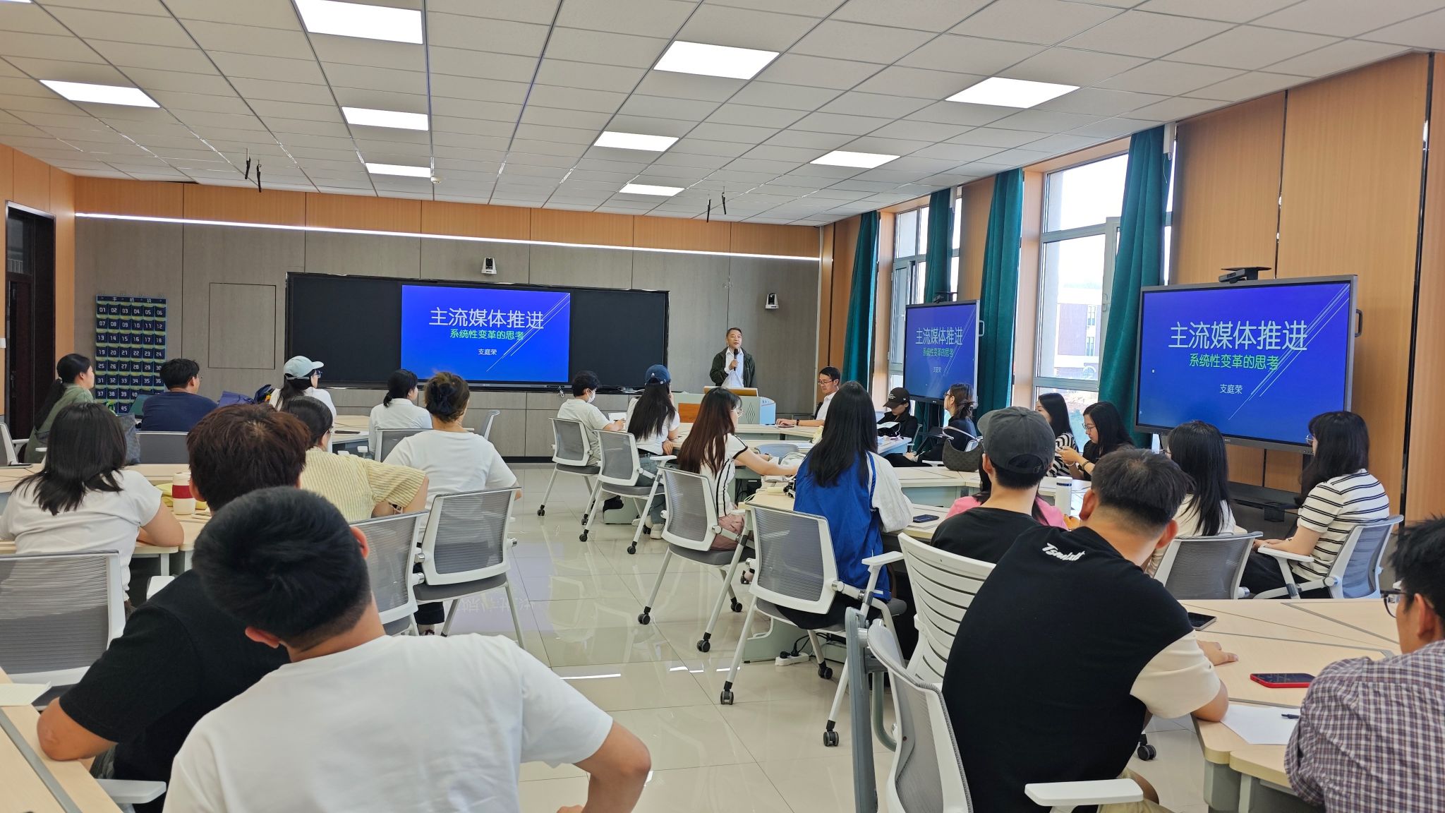 院长支庭荣教授开展题为《主流媒体推进系统性变革的思考》的专题讲座,讲座聚焦主流媒体如何深入贯彻落实中央关于推动媒体融合向纵深发展的决策部署,系统分析了媒体系统性变革的战略方向与实践策略,强调要坚守意识形态主阵地,全面提升传播力、引导力、影响力、公信力,为培养新时代新闻传播人才提供了重要的政治引领和理论指导。本次讲座由管媛辉院长主持。