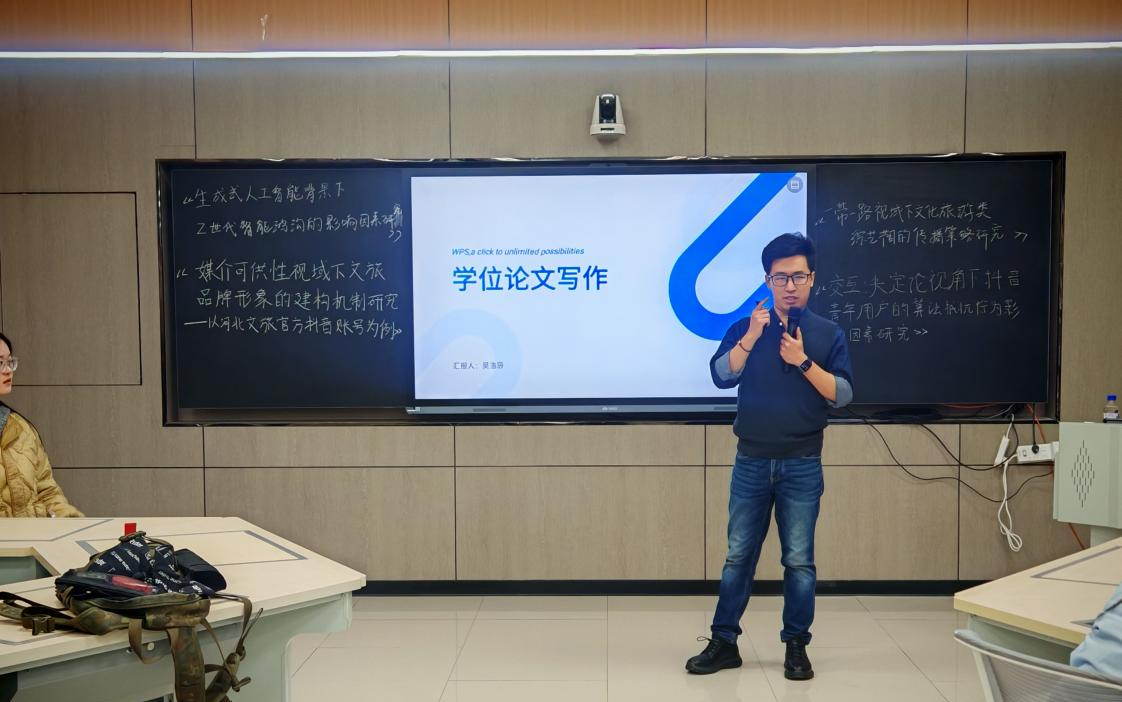 特邀东北师范大学吴浩辰博士在我院信息楼209智慧教室举行了一场关于学位论文写作经验的分享报告会,同院杜新宁博士作为协同嘉宾,助力学生应对论文各环节难题,降低校外盲审、抽查等环节的风险,让学生顺利地完成论文与答辩。