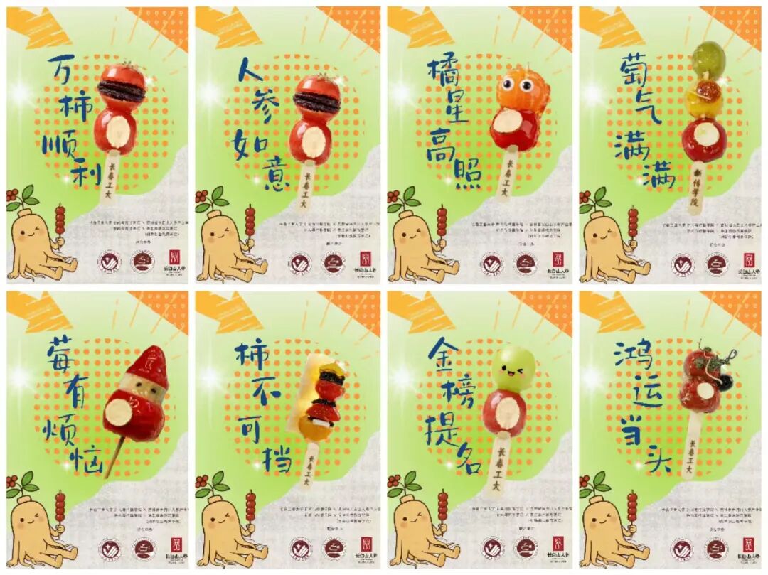 的师生们化身“文创匠人”,从食材甄选到造型设计全程亲力亲为。精选颗粒饱满的本地山楂,搭配营养价值丰富的长白山人参,经过去核、串制、熬糖、裹衣等多道工序,别出心裁的与人参蜜片、人参冻干片、人参花、人参粉、人参须等进行创意结合,制作出造型别致、酸甜可口的人参糖葫芦(人参如意)。除经典原味外,现场还推出了晴王葡萄(金榜题名)、丹东草莓(莓有烦恼)、圣女果(万柿如意)、砂糖橘(橘星高照)、奶皮子等创新口味,这些口味不仅满足了不同师生的味蕾需求,更饱含着学院对广大师生特别是即将踏上征途的考研同学们的真挚祝福。更有师生发挥专业特长,在糖葫芦包装上融入黄色直播