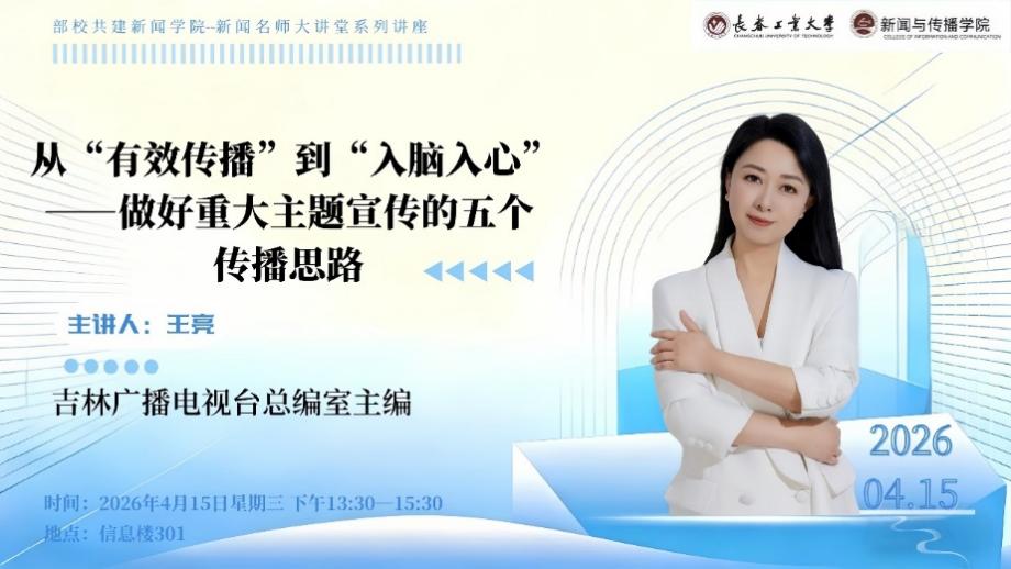 本网讯(通讯员:高雅雯 蔡进一) 2026年4月15日下午,我院隆重邀请到吉林广播电视台总编室王亮主编为学生们开展了一场主题为《从“有效传播”到“入脑入心”——做好重大主题宣传的五个传播思路》专题讲座。